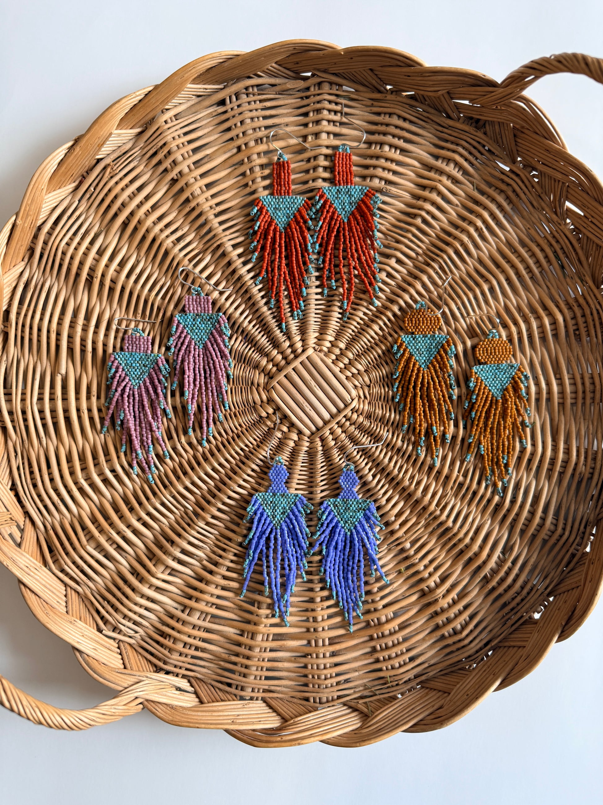 each pair features geometric shapes with flowing high quality Miyuki Delica seed bead fringe. inspired by desert skies, sun-warmed earth, + moments of everyday joy