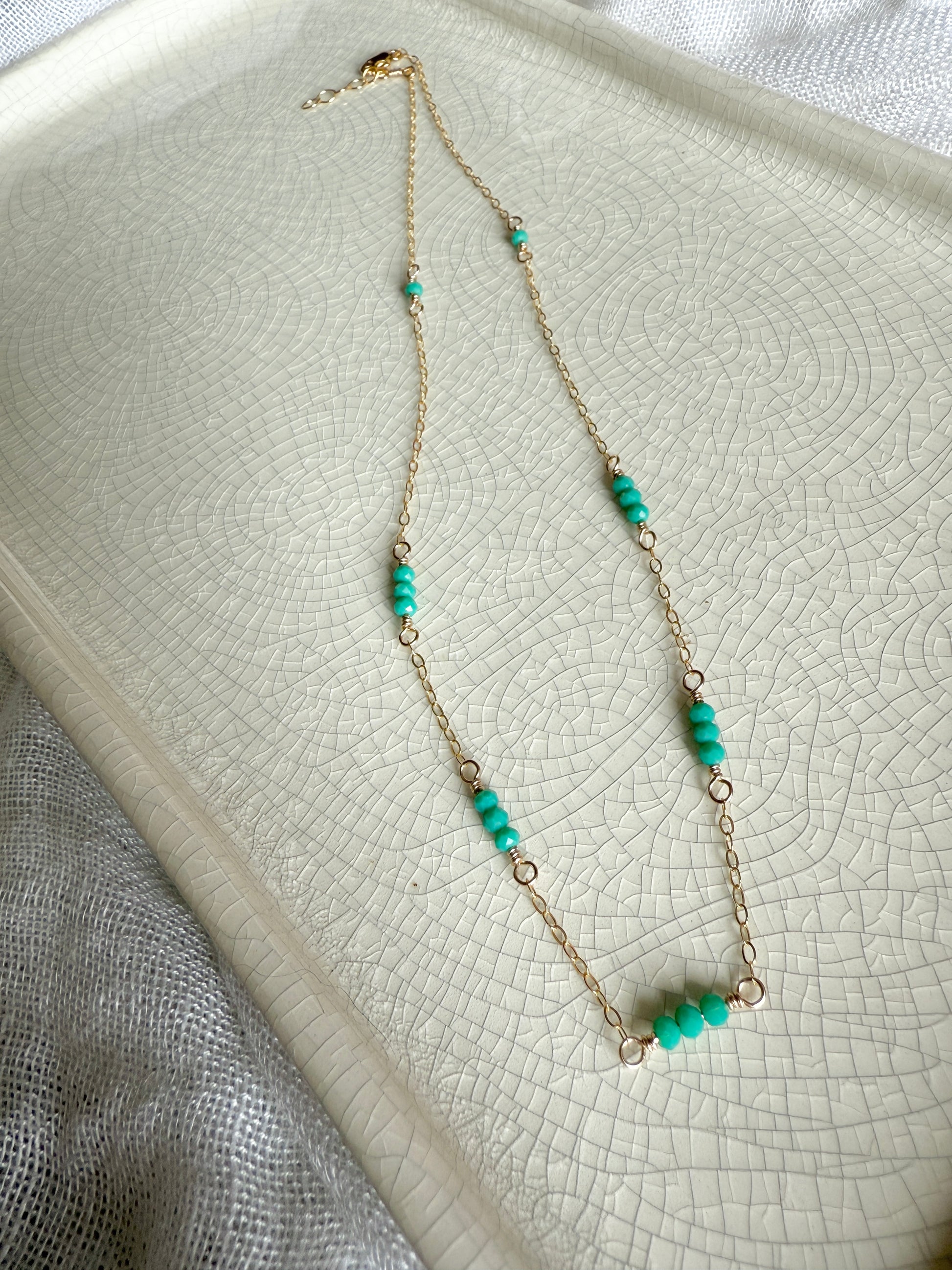 Elevate your style with the Golden Hour necklace. Featuring green German Quartz beads delicately spaced along a fine gold filled chain, this piece is both minimal and eye-catching